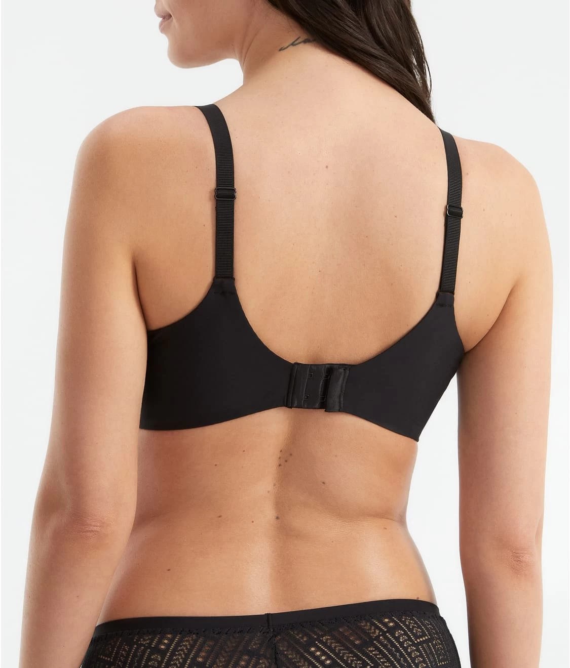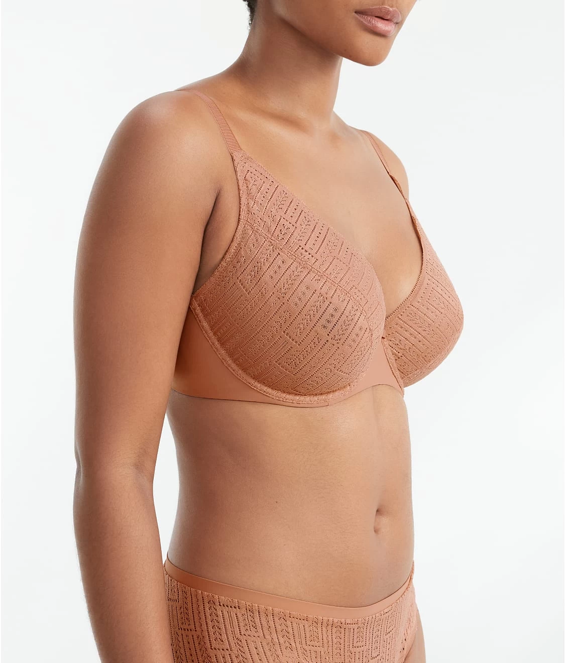 - Unlined seamed lace cups with with tone-on-tone tulle